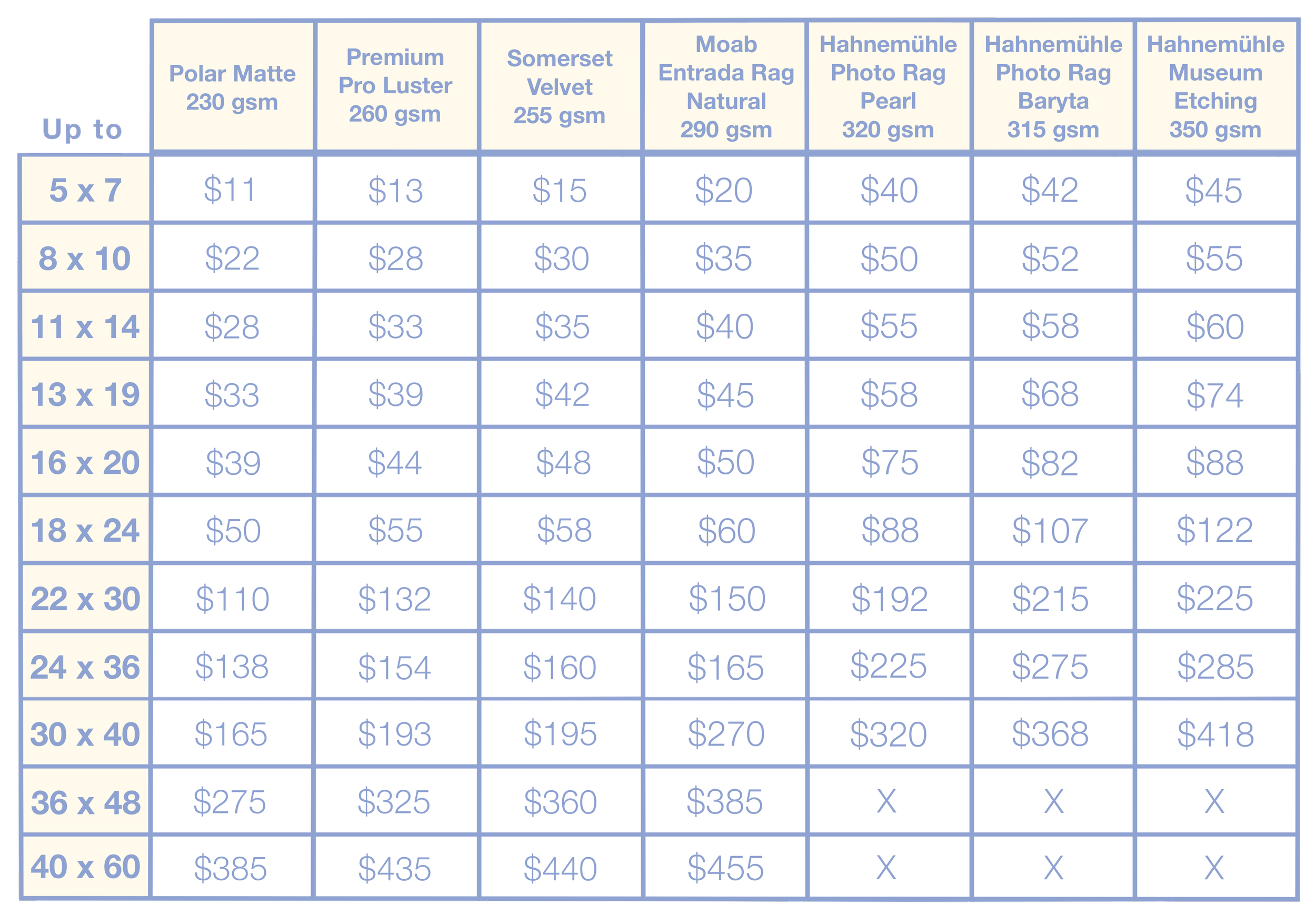 We print all sizes up to and including those listed on our pricing chart – an “X” indicates that the paper is unavailable in the respective sizes.