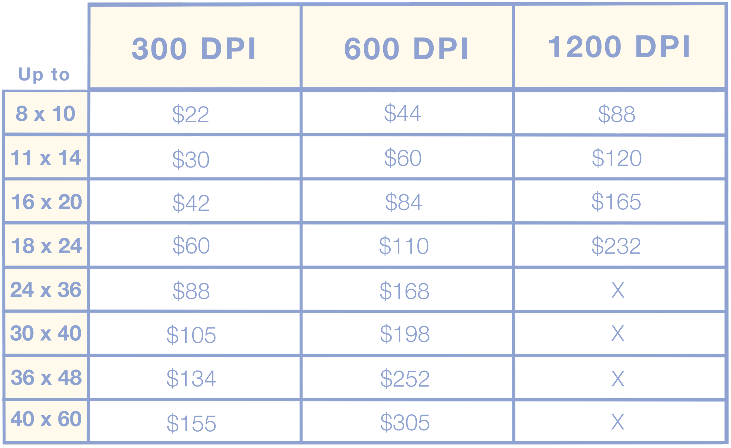An “X” indicates that 1200 DPI scanning is unavailable at this size, as high-resolution files at this scale exceed the technical limits of our system.